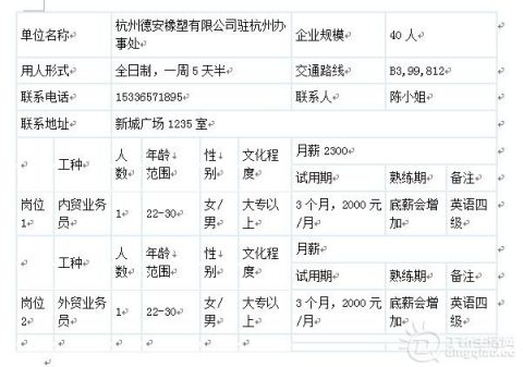 岗位2 外贸业务员 1 22-30 女/男 大专以上 3个月,2000元/月 底薪会增加 英语四级
